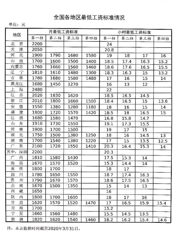 中国网财经4月26日讯 据人社部网站消息,人社部今日发布了全国各地区最低工资标准情况(截至2020年3月31日)。数据显示,上海、北京、广东、天津、江苏、浙江6省份的第一档月最低工资标准超过2000元。其中,上海最高为2480元。